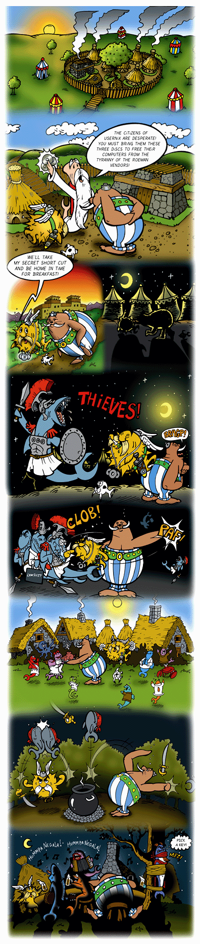 Join Puffy Hood and his Funny Fish as they take on the Sheriff (an unelected leader) and other evil forces of the draconian government! As we did for the 3.3 release, we have once again tried making release artwork and music which are allegorical of recent happenings. Two years ago we became involved with the University of Pennsylvania and DARPA, who were funding us to do security research and development .. on things that we were already intending to do. We provided ideas, wrote papers, and deployed cutting-edge technology; DARPA provided finances and reaped a share of the credit, and the University of Pennsylvania acted as a middle-man. We accepted funding based on the promise that our freedom to operate as we wished was unaffected. To us, freedom is more important than funding — heck, we were dealing with the evil forces of government, and needed to be careful. A few months prior to this release, DARPA suddenly and without warning decided to withdraw that funding; they also aggressively backed out of contractual obligations. Many articles in the press followed regarding this sudden maneuver. Apparently this hoopla happened because an OpenBSD-related article in the Canadian newspaper The Globe & Mail had quoted Theo de Raadt making anti-war statements regarding Iraq and the theft of oil. The only answer given (to major media reporters) by a DARPA spokesperson (Jan Walker) was this: "As a result of the DARPA review of the project, and due to world events and the evolving threat posed by increasingly capable nation-states, the Government on April 21 advised the University to suspend work on the "security fest" portion of the project." That almost toes the line of calling us terrorists! We had lost financial support, but the release of the statement above suddenly made us very happy to be free of any perceived obligation to such crazy people. Since the termination came near natural contract termination (about 4 months remained), less damage than expected was sustained by the project. Sponsors stepped forward and helped us make up the missing funds we needed to run our "Hackathon", and the event proceeded as planned. We even had T-shirts made with "Workstations of Mass Development" artwork for those developers who attended (sorry, they are not for sale). We could not make stories like this up. So instead, we are making up an allegory about it, using the tale of Robin Hood. |